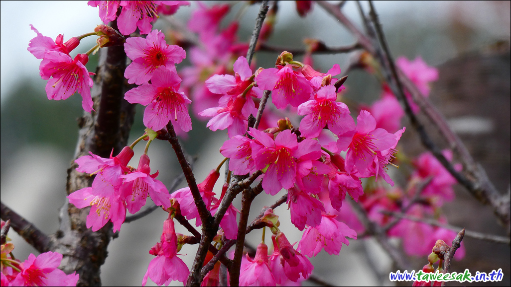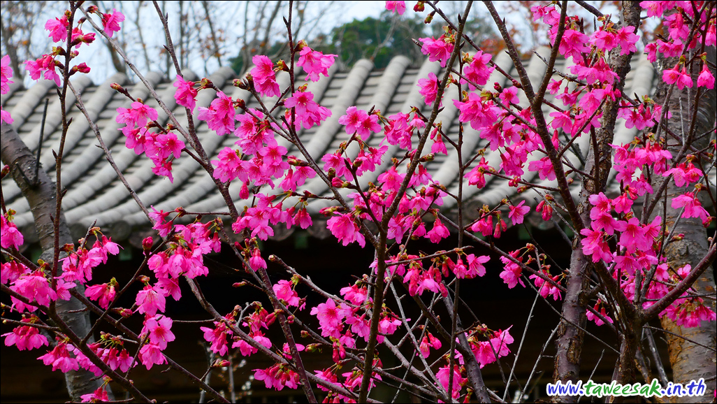 มองไปไกลๆ เห็นต้นไม้สีชมพูเข้มทั้งต้น ก็แอบดีใจว่า ได้เห็นซากุระไต้หวันเป็นครั้งแรก แถมยังกำลังบานอย่างเต็มที่ จะอดไม่ได้ที่จะเก็บบันทึกภาพสีสันสดใสมาเก็บไว้ในความทรงจำ แม้ว่าจะมีเพียงต้นเดียว แต่ทว่าสีชมพูเข้ม ตัดกับสีท้องฟ้า ช่วยเพิ่มความสดใสอีกด้วย