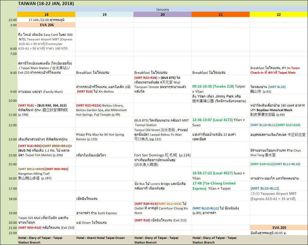 มาดูแผนการเดินทางตลอดทั้ง 5 วัน เผื่อเป็นข้อมูลสำหรับผู้ที่อยากมาเที่ยวไต้หวันด้วยตัวเอง แบบอิสระตามใจตัวเองกัน โดยจะบอกวิธีการเดินทาง สถานีรถไฟฟ้า MRT พร้อมการต่อแต่ละสาย และสายรถเมล์ ซึ่งความสนุกของการเดินทางไม่เพียงแต่สิ่งที่ได้พบเจอระหว่างการเดินทาง แต่ทว่า การวางแผนการเดินทาง การตัดสินใจเลือกโรงแรม เลือกขบวนรถไฟและวิธีการเดินทาง ถือเป็นความสนุกด้วยเช่นกัน