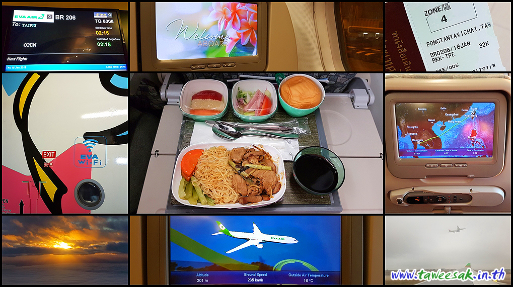 ขึ้นเครื่องราวตี 2 เครื่องยังไม่ทันออกบิน ก็ถือโอกาสงีบหลับซะแล้ว รู้สึกว่านอนไปไม่นานนัก ก็รับประทานอาหาร โดยงงๆ กับตัวเอง นี่มันมื้อไหนเนี่ย เพราะทานตอนตี 3 กว่าๆ แต่ก็ดี ทานอิ่ม จิบไวน์แดงเพื่อมอมตัวเอง ก็หลับต่อ ตื่นเช้ามาเกือบถึงไทเป ก็รู้สึกว่าพร้อมท่องเที่ยวกันแล้ว เมื่อเครื่องลงเรียบร้อยก็เดินมาที่ ตม. เป็นคนแรก โดยยื่นแค่พาสปอร์ต เพราะทว่าได้ กรอกใบ ต.ม. ผ่านเว็บล่วงหน้าก่อนเดินทางแล้ว ถือว่าสะดวกมากๆ ก็ผ่านออกมารอรับกระเป๋าเดินทาง