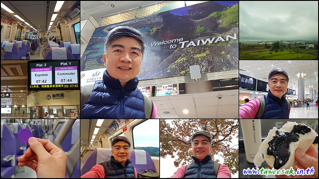 สิ่งแรกที่ต้องทำ คือ ซื้อตั๋วรถไฟด่วน (Taoyuan Airport MRT) ในราคา 160 NT เพื่อเดินทางเข้ามายังสถานี Taipei Main โดยจะมีให้เลือกทั้งแบบ Express (เร็วกว่าเพราะไม่ได้จอดทุกสถานี) และ Commuter (ช้ากว่าเพราะต้องจอดทุกสถานี) ดังนั้น เราจึงรอขึ้นขบวน Expresss ทั้งที่จ่ายในราคาเท่ากัน