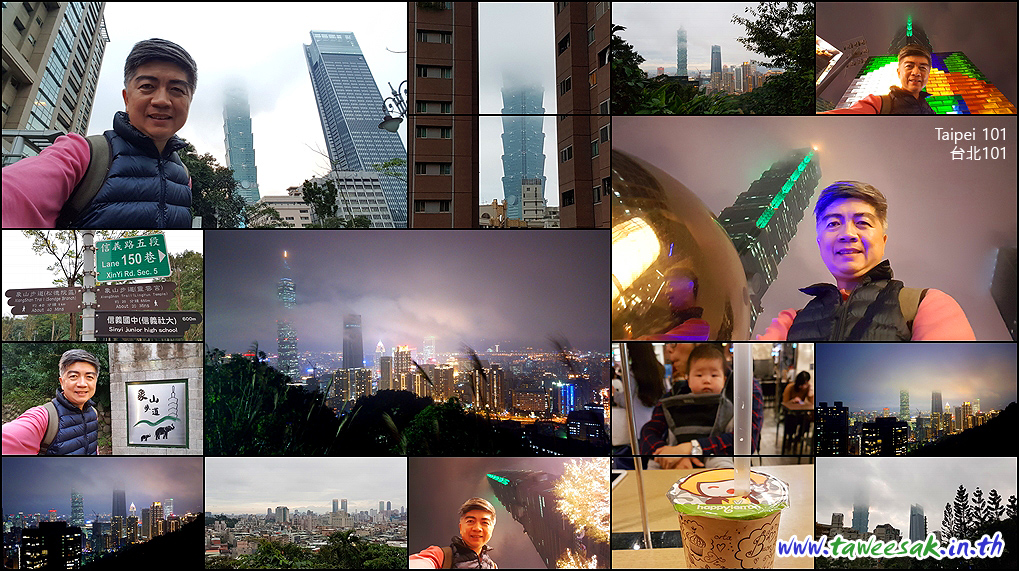รีบเดินจากสถานีเพื่อไปยัง เขาช้าง (Elephant Mountain) (象山) หรือ Xiangshan Hiking Trail เพราะจุดนี้จะเป็นจุดที่จะสามารถเห็นภาพมุมสูงของเมืองไทเป และความสวยงามของตึกไทเป 101 ซึ่งเป็นสถานที่ที่เหล่าบรรดานักท่องเที่ยวและช่างภาพต่างๆ มักจะมาเก็บภาพสวยๆ กัน ณ ที่แห่งนี้ ซึ่่งกว่าจะได้ภาพประทับใจในวันนี้ ยากมากๆ เพราะเมฆบังยอดตึกไทเป 101 ตลอดเวลา โชคดีเป็นของเรา มีช่วงที่พอเห็นยอด ก็เลยรีบกดถ่ายจากโทรศัพท์มือถือแบบรัวๆ ลมพัดเอื่อยๆ ฝนก็เริ่มจะโปรยปราย ด้วยความที่กลัวจะป่วยซะก่อน จึงเดินลงจากเขา เพื่อไปยังตึกไทเป 101 ไปหากอะไรดื่มให้ชื่นใจ เพราะซูชิและอาหารทะเล ยังไม่ขยับไปไหน ยังแน่นพุงอยู่ จึงดื่มชานมไข่มุกไปซักแก้ว ก่อนนั่งรถไฟฟ้า MRT กลับมายังสถานี Taipei Main และเดินออกทาง Exit Z10 เข้าสู่โรงแรมพักผ่อนเอาแรง ไว้ลุยกันต่อในวันพรุ่งนี้ ไว้มาตามกันต่อนะ