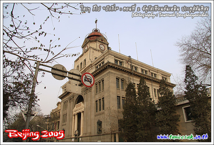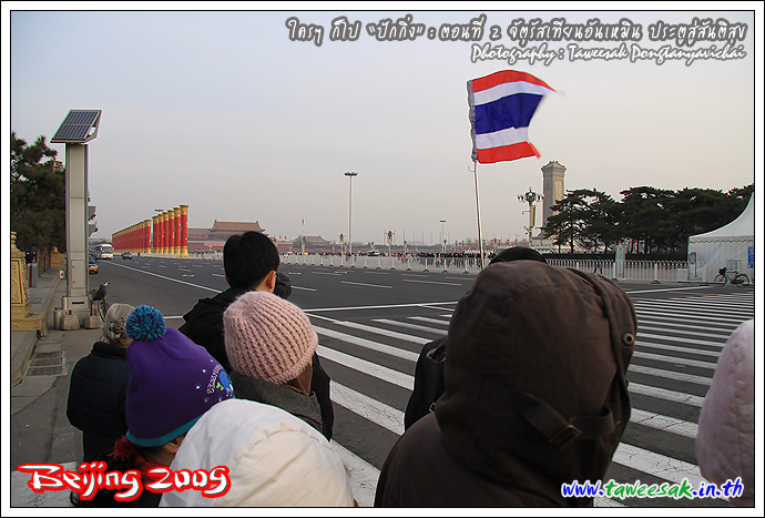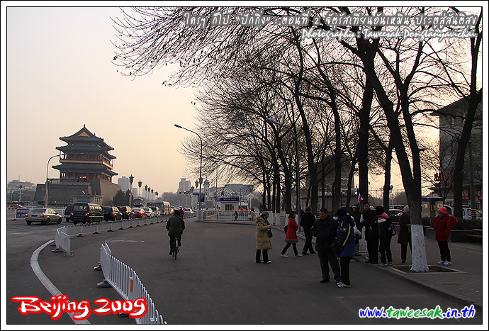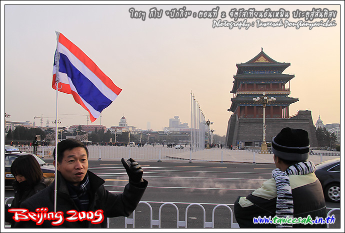 ธงไทยไปพริ้วสะบัดบริเวณจัตุรัส เราจะได้ไม่หลงกัน แต่อย่าเผลอนะ เพราะเห็นธงไทยอยู่อีกหลายกลุ่ม แสดงว่าเราคนไทย หนีร้อนมาสู้หนาวกันหลายกรุ๊ป ... มองเห็น "หอธนู" อยู่ด้านบน กับ "เฉียนเหมิน" ซึ่งเป็นประตู 2 ชั้น