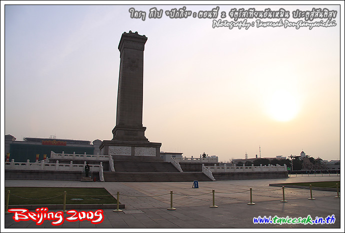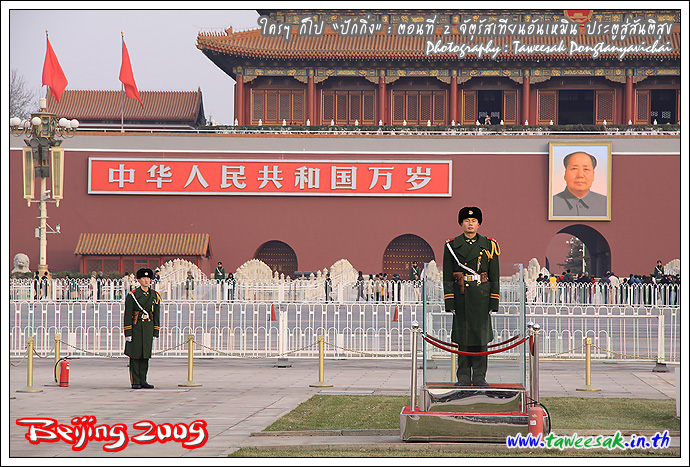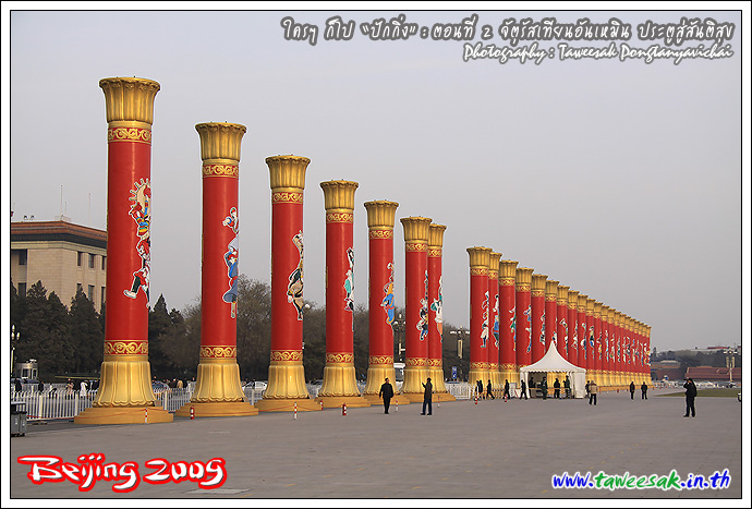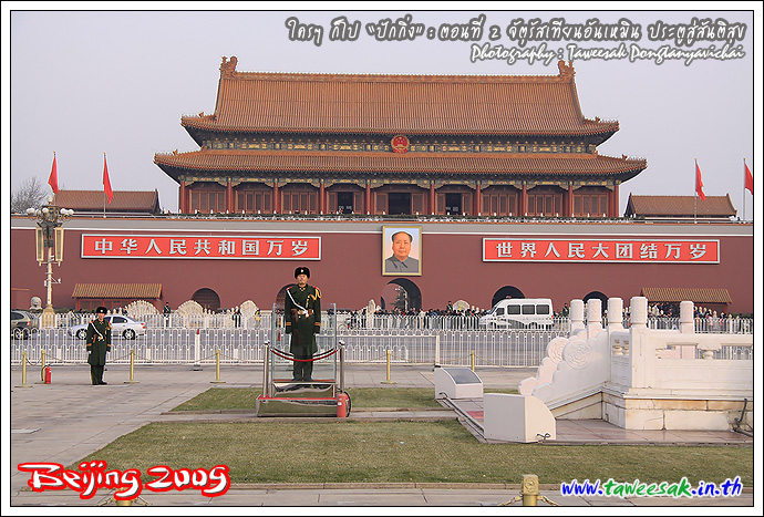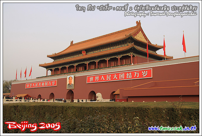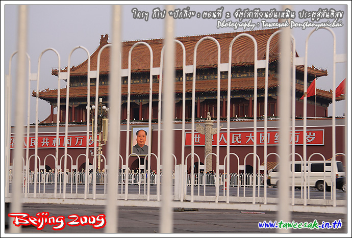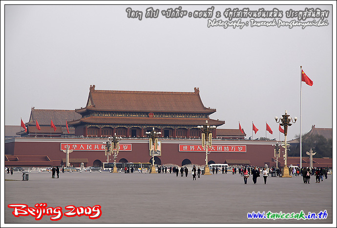 หากถามว่า ทำไมจึงอยากมาเที่ยวปักกิ่ง หนึ่งในรายการที่ตั้งใจไว้ ก็คือ อยากมายืน ณ จุดนี้ "จัตุรัสเทียนอันเหมิน" (Tian'an Men Square) เป็นภาพที่เรียกได้ว่า เป็นสัญลักษณ์อย่างหนึ่งของประเทศจีนก็ว่าได้ ซึ่งเคยเห็นภาพนี้บ่อยครั้งในจอทีวี และก็สงสัยต่อไปว่า มีอะไรในนั้น โดยที่ผมก็มายืนแบบงงๆ เพราะไม่ได้ศึกษาอะไรมาก่อนเลย กะมาเปิดหูเปิดตา รับทราบเรื่องราวไปพร้อมๆ กับชมสถานที่ไป
