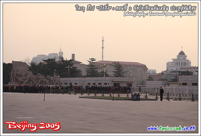 คงจะรอเข้าไปชมภายใน "อนุสรณ์สถานประธานเหมา" อาคารที่เห็นในภาพ ซึ่งเป็นที่ตั้งโลงบรรจุศพประธานเหมาเจ๋อตง อยู่กลางห้องโถงในอาคาร ซึ่งท่านถึงแก่อสัญกรรม เมื่อวันที่ 9 กันยายน ค.ศ. 1976 โดยอนุสรณ์สถานแห่งนี้สร้างขึ้นภายใน 1 ปี โดยศพของท่านอยู่ในโลงแก้วคลุมธงชาติสีแดง ตั้งบนแท่นในหอกลางของจัตุรัสเทียนอันเหมิน โดยโลงศพจะถูกยกขึ้นจากห้องเย็น เพื่อให้ประชาชมเข้าชมวันละ 2 ครั้ง
