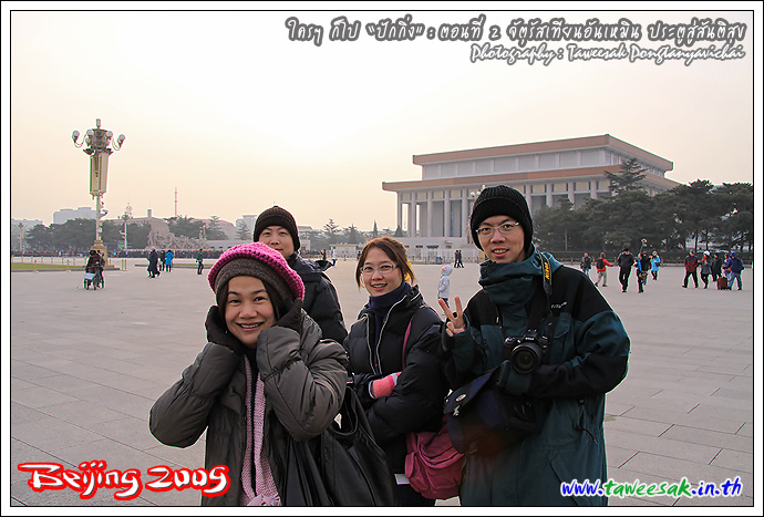 รถบัสพาเราเดินทางมาถึงบริเวณจัตุรัสเทียนอันเหมิน ได้เวลาลงรถไปผจญความหนาวติดลบกันแล้ว แต่พวกก็เลือกมาช่วงหนาว เพราะอยากโต้ลมหนาวของจริง ขืนมาเที่ยวปักกิ่งหน้าร้อน คงแย่แน่เพราะร้อนมาก และอาจเจอพายุทะเลทรายเป็นของแถมอีกด้วย