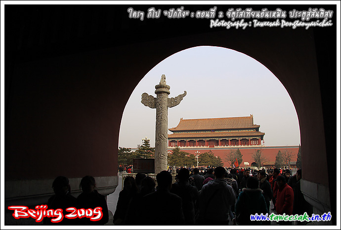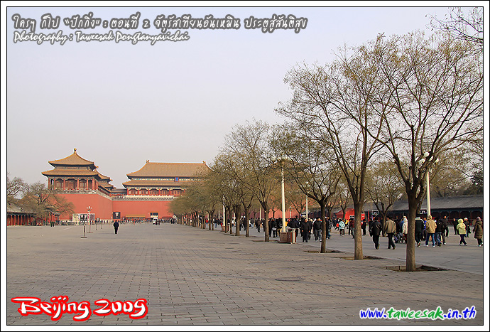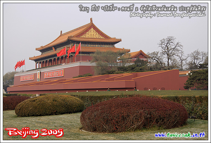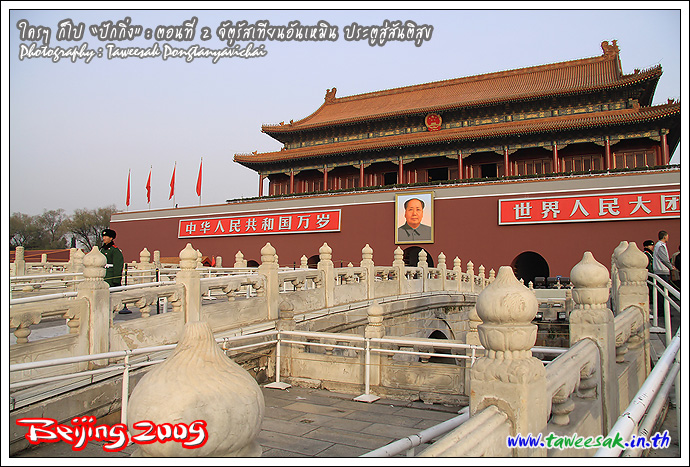 เริ่มเดินเข้าไปใกล้ประตูสวรรค์สันติ หรือประตูเทียนอันเหมิน นั่นเอง เป็นเครื่องหมายการเข้าสู่พระราชวังจักรพรรดิ สร้างขึ้นในราชวงศ์หมิงเมื่อปี ค.ศ. 1417