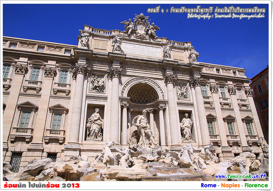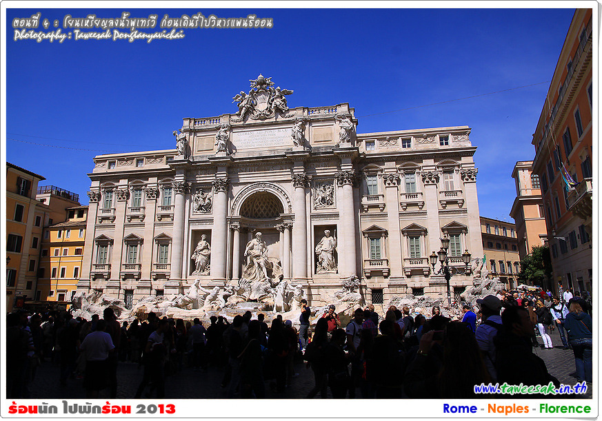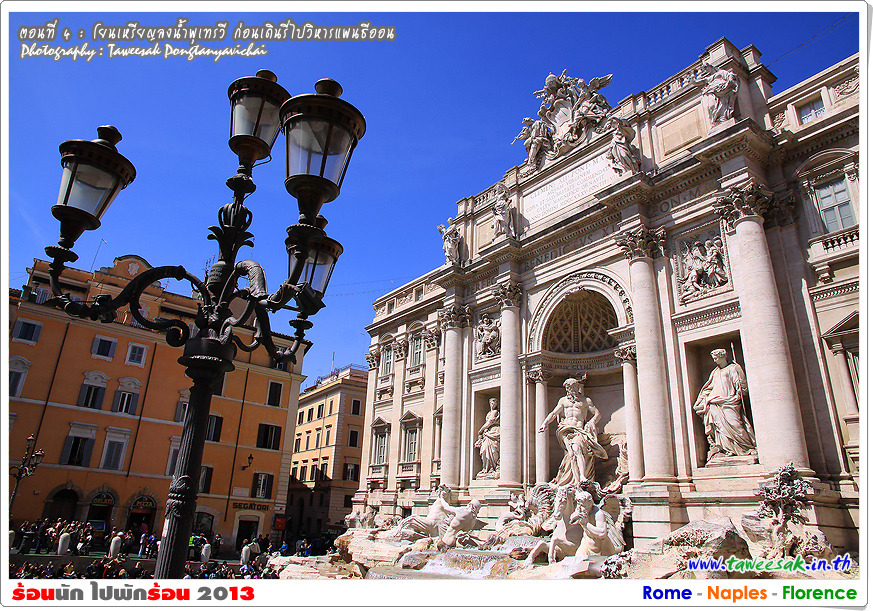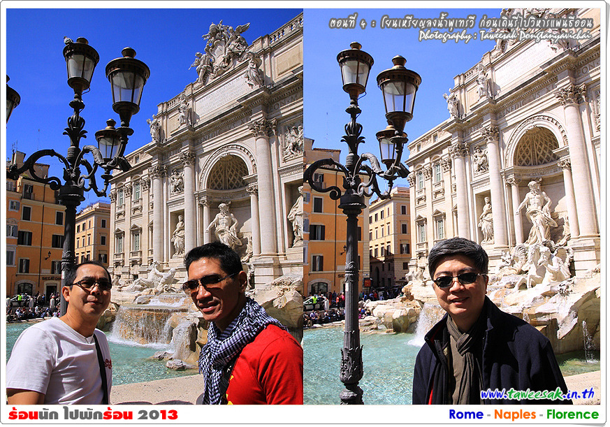 พวกเราเดินเท้ากันมาถึง น้ำพุเทรวี (Fontana Di Trevi) เป็นจุดหมายหนึ่งของทริปนี้ที่จะพลาดไม่ได้ ด้วยเพราะเคยเห็นรูป ดูสารคดีท่องเที่ยว และที่สำคัญคือ ต้องมาโยนเหรียญ เพื่อจะได้กลับมาโรมอีกด้วยกระมัง ด้วยมีความเชื่อในตำนานกันว่า หากใครหันหลังโยนเหรียญลงในอ่างน้ำพุ ก็จะได้กลับมาที่โรมอีก จนกระทั่งมีคนโยนเหรียญลงน้ำพุเทรวี ถึงวันละประมาณ 3,000 ยูโร (ราวปีละ 44 ล้านบาท)
