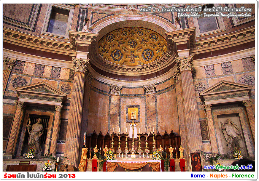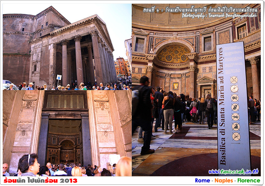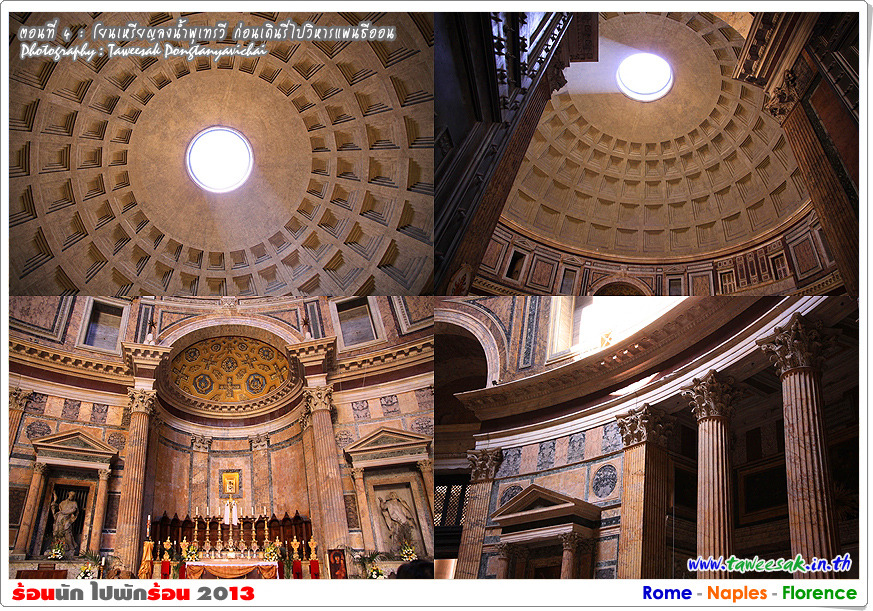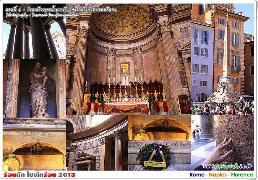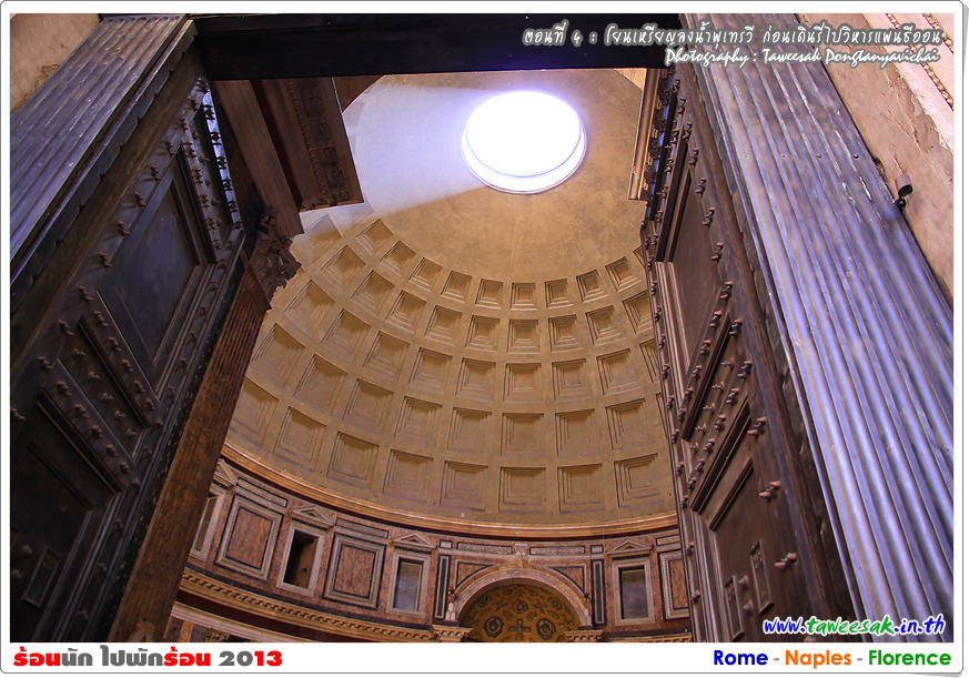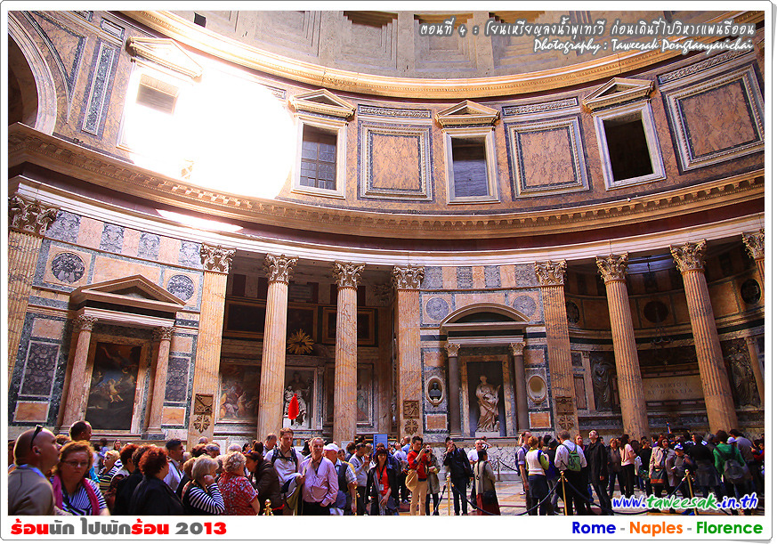 จุดหมายอีกแห่ง ที่เราต้องเดินรี่มาในบ่ายวันนี้ ก็คือ วิหารแพนธีออน (The Pantheon) วิหารที่มีอายุกว่า 2,000 ปี ที่ยังอยู่ในสภาพที่สมบูรณ์ที่สุดของอิตาลี ซึ่งภาษากรีก คำว่า Pantheon แปลว่า มวลเทพ หรือ แด่เทพเจ้าทั้งปวง
