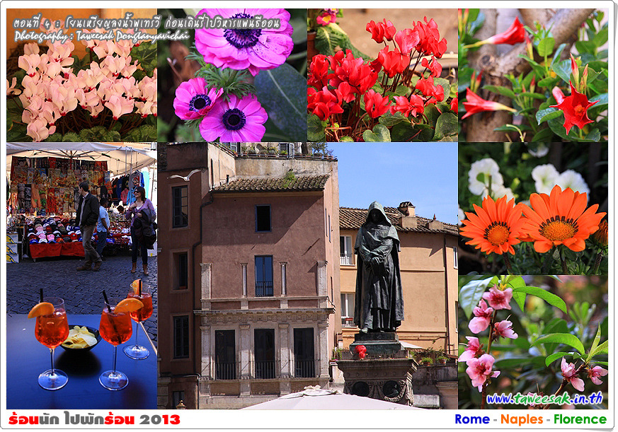 จุดที่น่าบันทึกภาพความประทับใจไว้ชมนานๆ ... เราทั้ง 4 คน เดินกันมาถึงยังบริเวณตลาดลานบุปผชาติ (Campo De Flori) แต่เนื่องจากเรามาถึงในช่วงเย็น ตลาดดอกไม้ก็วายไปหมดแล้ว คงเหลือร้านค้าที่ขายผลผลิตของชาวสวน ชาวไร่ ที่นำผลิตผลมาขาย ดังนั้นขอนำภาพดอกไม้ที่เก็บบันทึกระหว่างการเดินและพบเห็นมาไว้แทนแล้วกัน