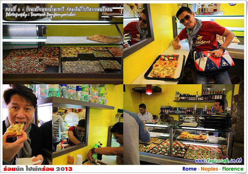 เดินมาก ใช้พลังงานมาก ก็ต้องเติมพลังกันหน่อย ซึ่งอะไรๆ ก็ไม่ดีไปกว่า พิซซ่า (Pizza) ในต้นตำรับอาหารยอดนิยมนี้ ที่กระจายไปทั่วโลก ยืนอยู่หน้าร้านแล้วแทบจะอยากชี้ให้คนขายหยิบมาหน้าละชิ้น เพราะดูน่าหม่ำไปซะทุกหน้า ในที่สุดก็ได้มา 3 แบบดังภาพ ช่วยสร้างพลังงานส่งตรงถึงขาได้อย่างรวดเร็ว