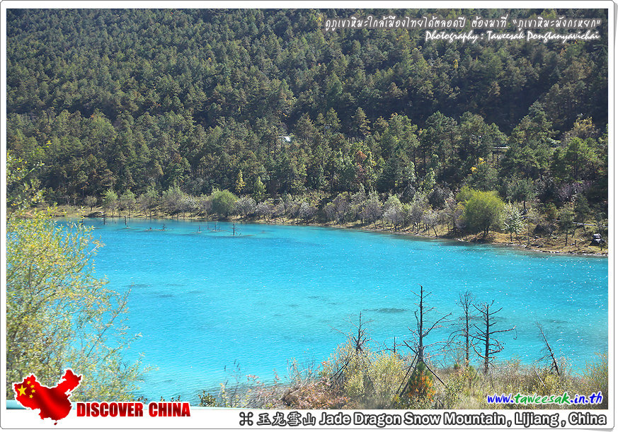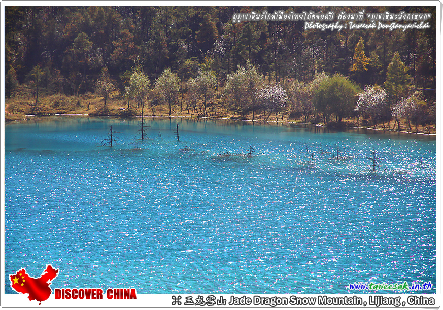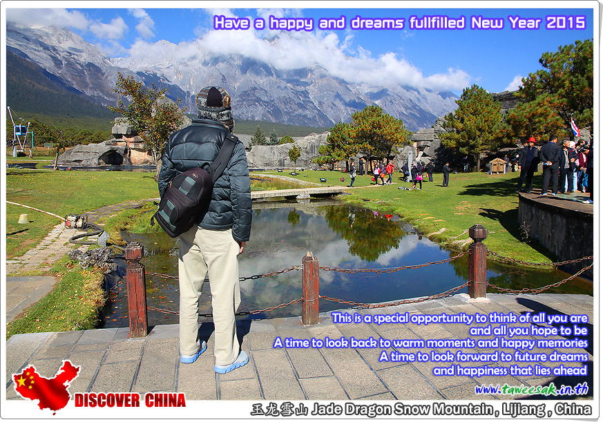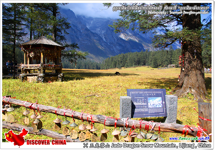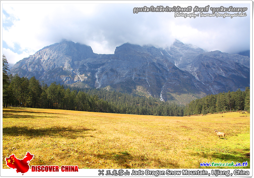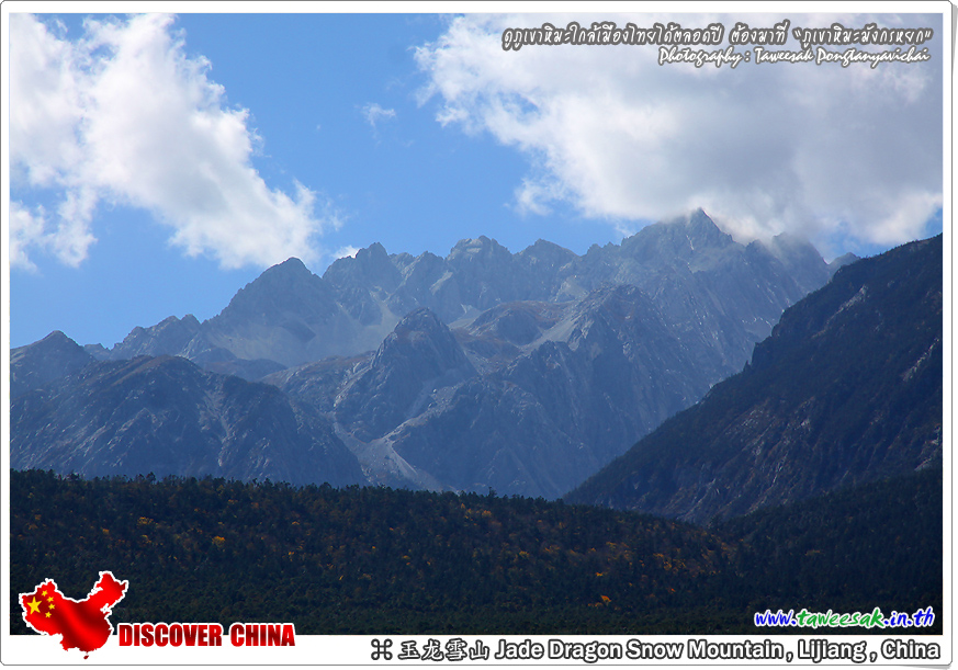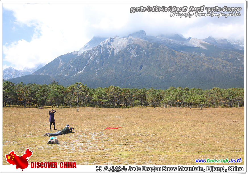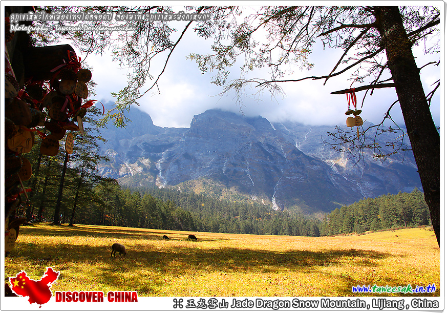 และมีฉากหลังเป็นภูเขาหิมะมังกรหยก (玉龙雪山 - Yùlóngxuě Shān - Jade Dragon Snow Mountain)